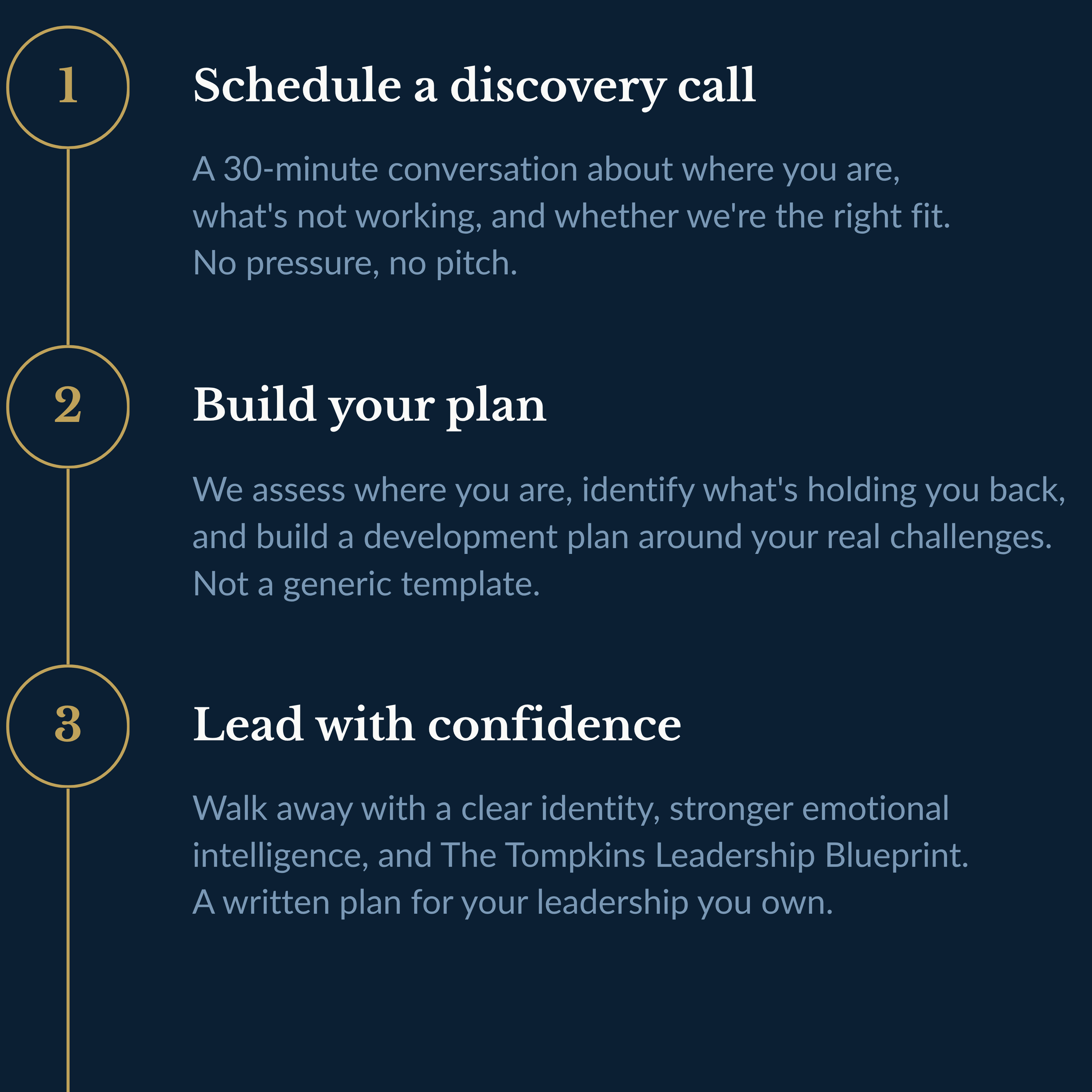 You'll walk away with a clear leadership identity, stronger emotional intelligence, and The Tompkins Leadership Blueprint